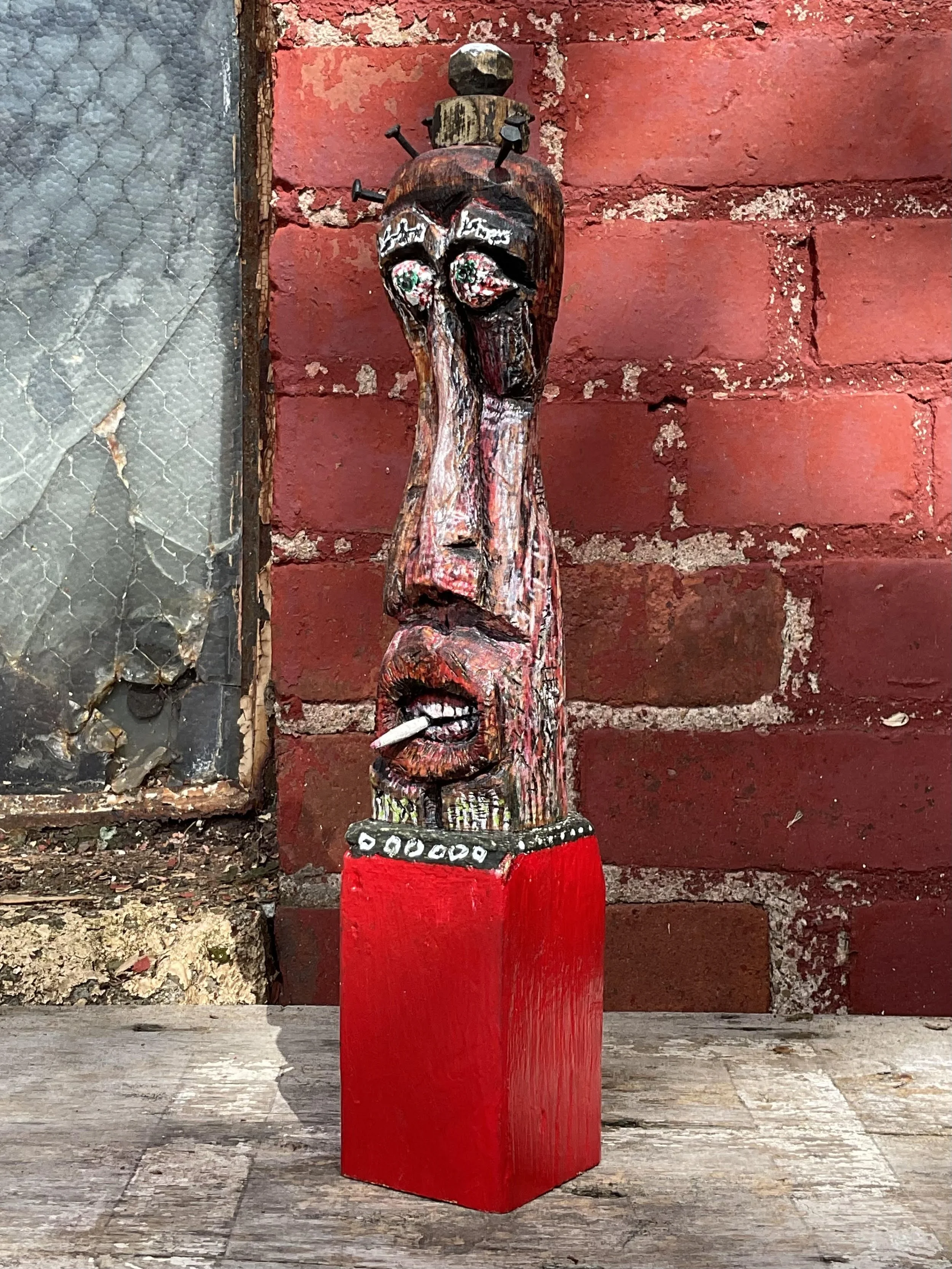 75” x 6” x 6” / Carved and painted pine, oak and found objects / $2500